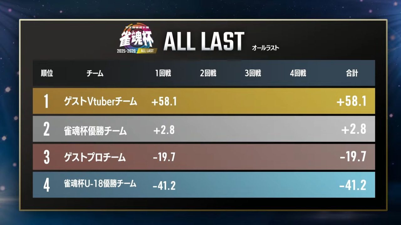 2025-2026シーズンの集大成となるチーム戦「雀魂杯 学生麻雀選手権 2025-2026」ALL LASTが、3月28日(土)に開催されました。 今シーズンから新たに設けられたこのALL LASTは、年4回にわたる「雀魂杯」各回の優勝者がチームを組み、ゲストプロチーム、ゲストVTuberチームと対戦するエキシビション大会です。