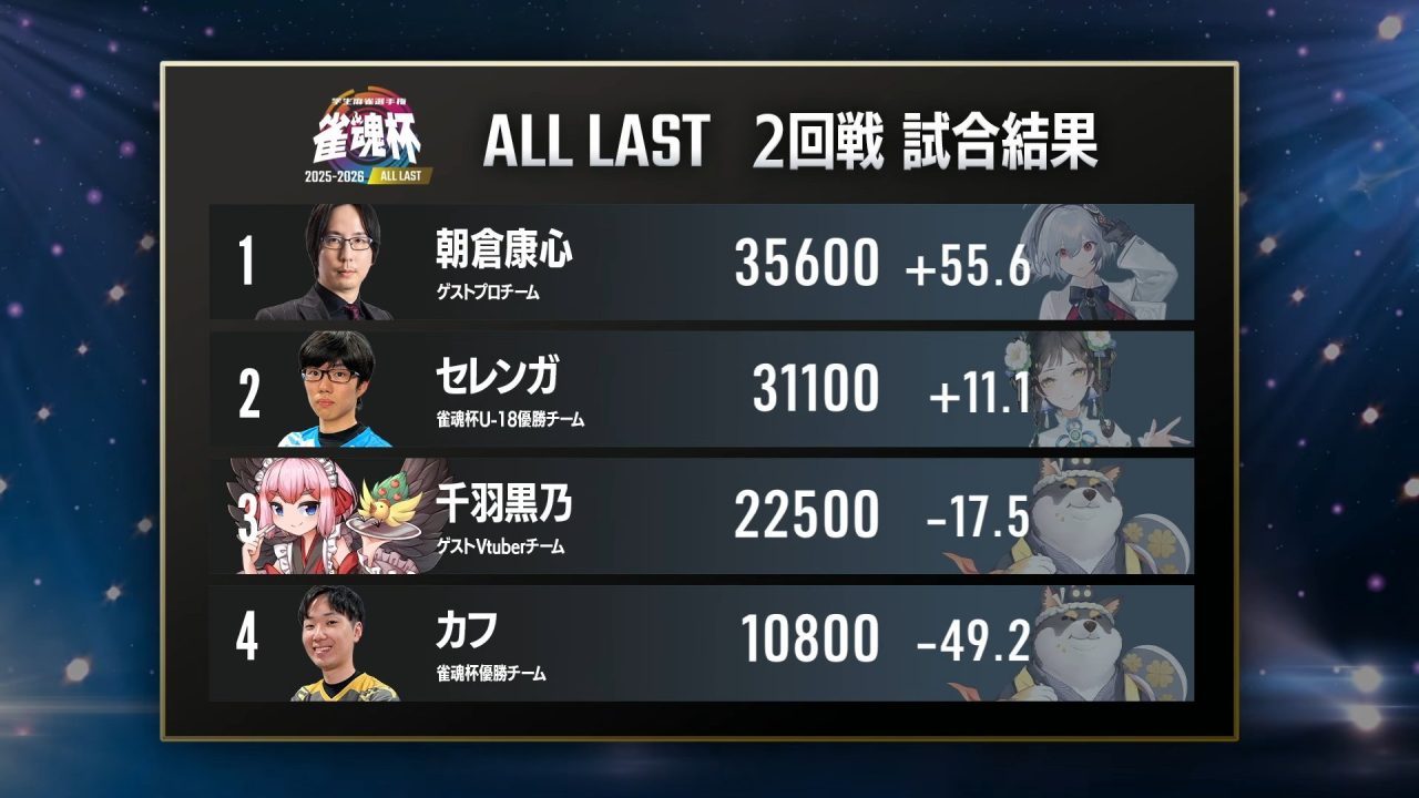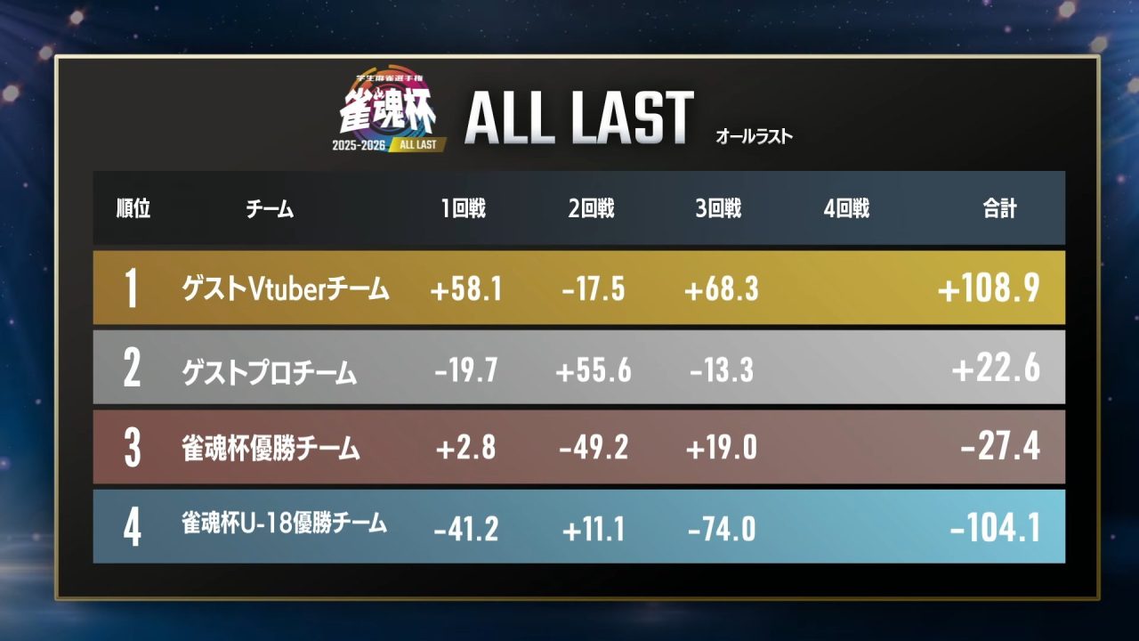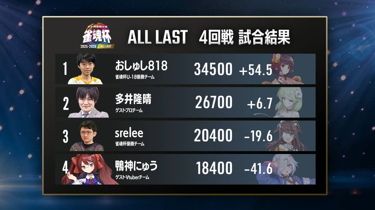 2位は多井プロ。VTuberチームとのトップラスを狙い、条件達成に向けて打ち回しましたが、おしゅし818選手の勢いを止めきれず。それでも自身の条件を最後まで追い続ける姿は、30年以上アンカーを務めてきたプロの矜持でした。