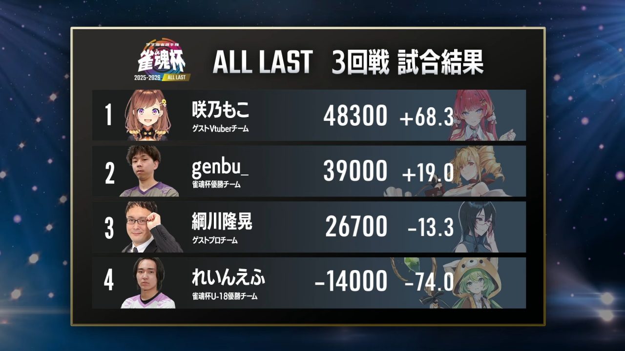 一方、4位で終えるもチームスコアを守りきった鴨神にゅう選手は、チームのリードを活かした慎重な麻雀を展開。テンパイしてもダマテンに構え、リスクを最小限に抑える打ち方で、VTuberチームの優勝を守り切りました。