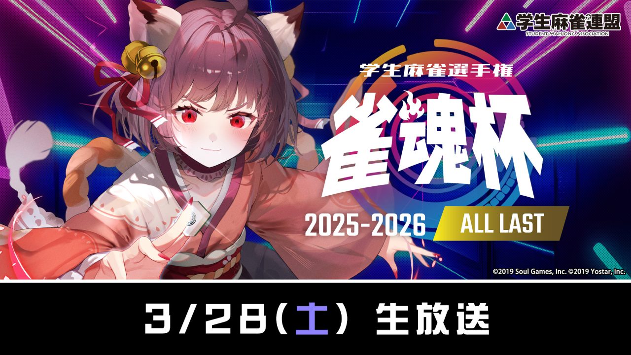 3月28日(土)に、ついに各大会の優勝者がチームとなってプロチームとVTuberチームに挑む「雀魂杯 学生麻雀選手権 2025-2026」ALL LASTが実施されます。