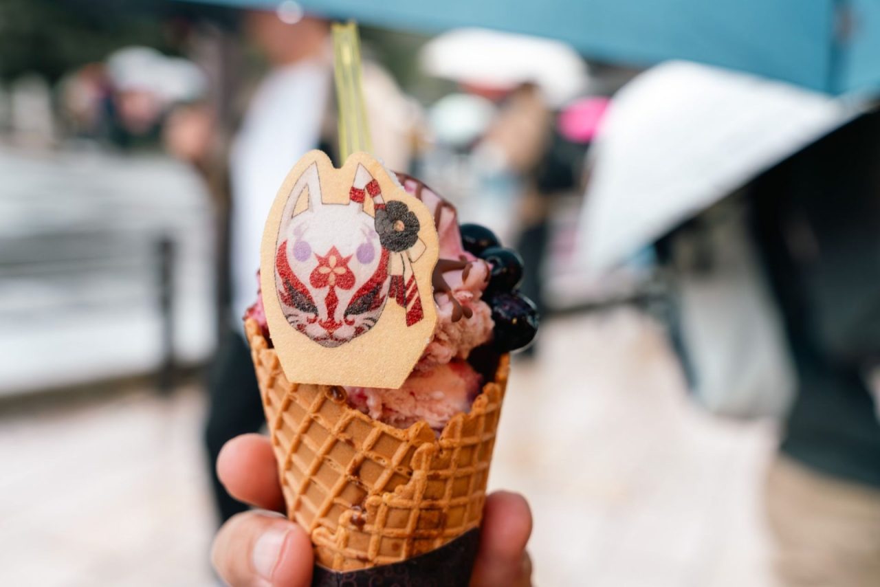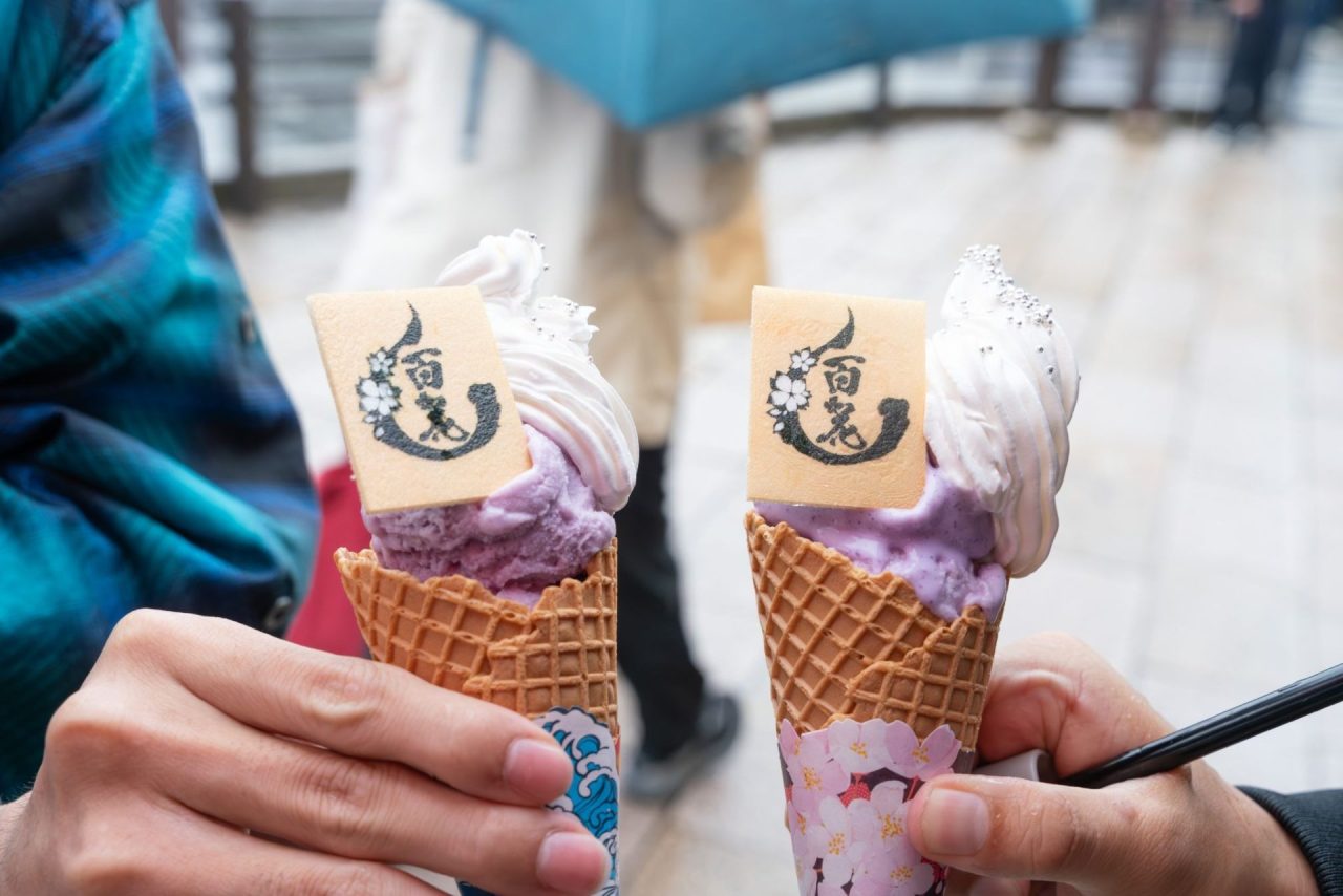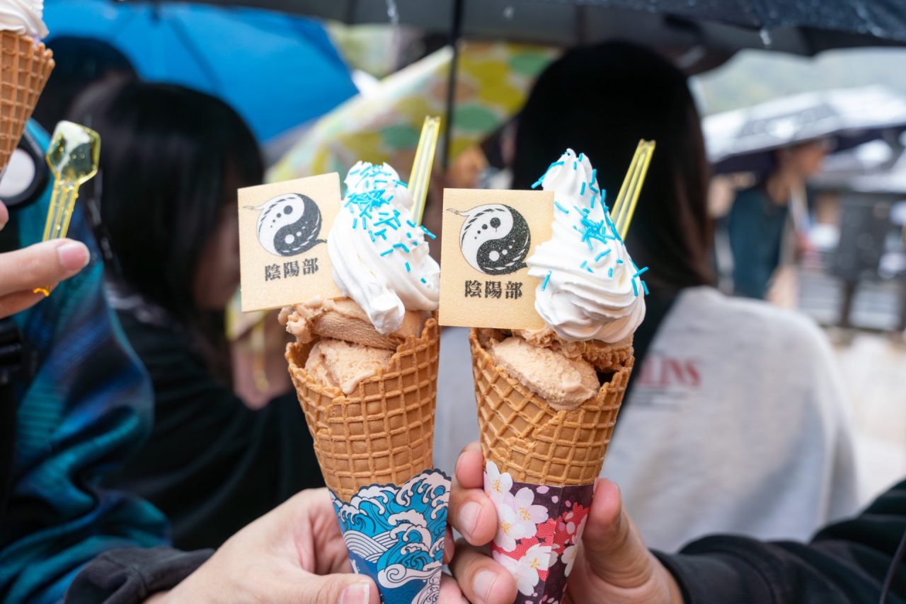 さらに嵐山駅徒歩1分のところにある「新八茶屋」では、レンゲが出迎えてくれるほか、コラボジェラートの販売中です。コラボジェラートのメニューは、百花繚乱紛争調停委員会(紫芋ジェラート)、陰陽部(きな粉ベースのミルクジェラート)、ワカモ(イチゴミルクとカシスのジェラート)の全3種類。それぞれのジェラートには、メニューに合わせたオリジナルのプリントもなかがあるのもポイントです。