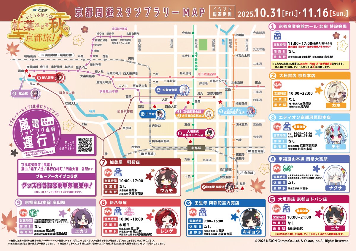 百鬼夜行連合学院の生徒たちが古都を彩る2025年、秋。10月31日(金)より、京都スタンプラリーの第2弾となる『ブルーアーカイブ ~いとうるはし☆紅葉たどる秋の京都旅~』が開催中です。