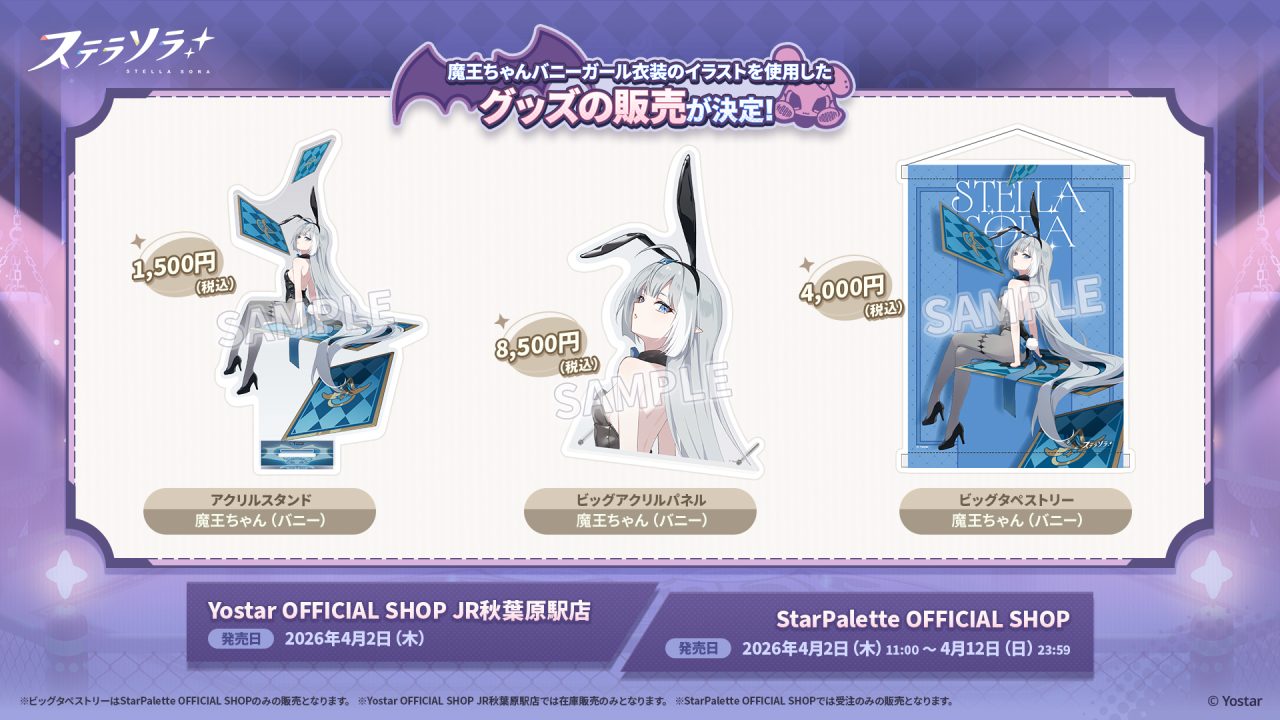そしてなんと、動画でお披露目された「魔王ちゃん(バニー)」描き下ろしイラストを使用した各種グッズの販売も決定しました!明日4月2日(木)よりYostar OFFICIAL SHOP JR秋葉原駅店にて店頭販売が行われるほか、通販サイト「StarPalette OFFICIAL SHOP」では4月12日(日)まで受注販売受付も実施されます。こちらもぜひお見逃しなく!