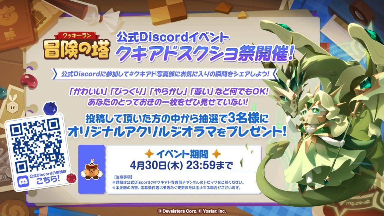 公式Discordでは、「クキアドスクショ祭」も開催中。ゲーム内のお気に入りの瞬間を撮影してシェアすると、抽選で3名様にオリジナルアクリルジオラマがプレゼントされます。
