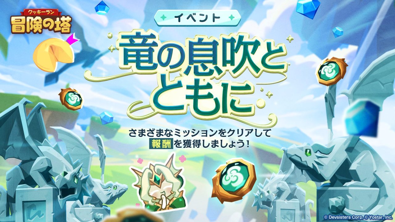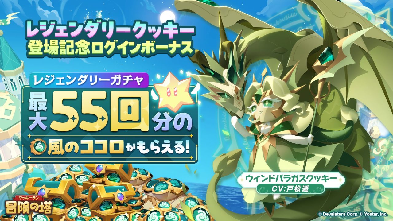「レジェンダリーガチャ」を引くことができる、専用アイテム「風のココロ」は、現在開催中のイベント「竜の息吹とともに」(※1)と「レジェンダリークッキー登場記念ログインボーナス」(※2)で獲得できます。期間中にログインしたりイベントのミッションを達成したりすることで、「風のココロ レジェンダリーガチャ」専用アイテムである「風のココロ」を、合計でガチャ100回分以上獲得することができます。「風のココロ レジェンダリークッキーガチャ」を最大100回引くと、「ウィンドパラガスクッキー」を確定で入手できるので、この機会をお見逃しなく!