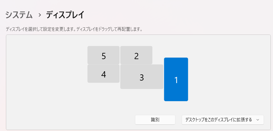 5枚を使い分ける基準は明確です。下段3枚(1、3、4番)が主戦場で、映像制作や成果物のチェック、不具合確認やプログラミングなどに使用しています。
