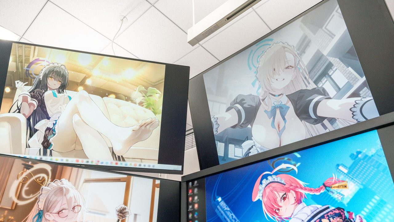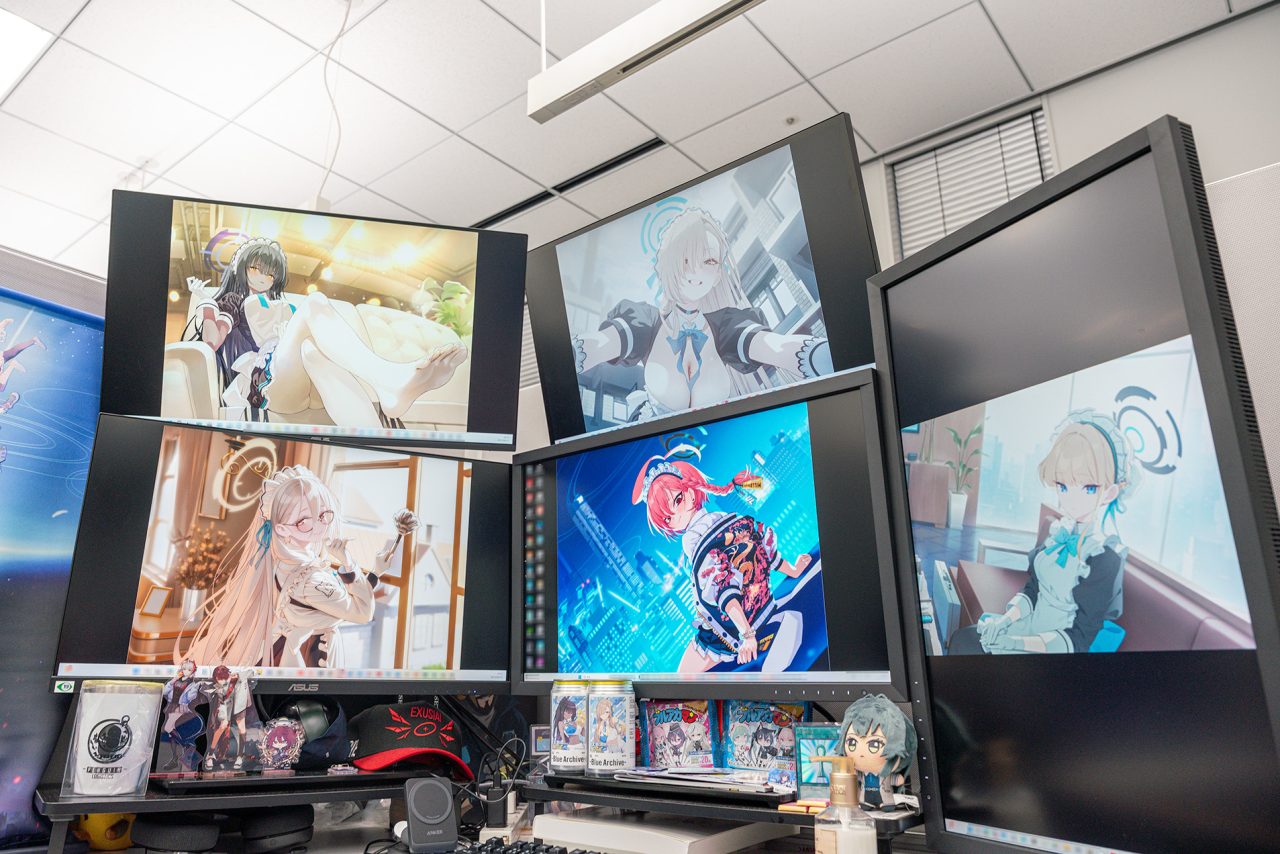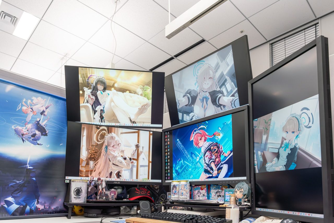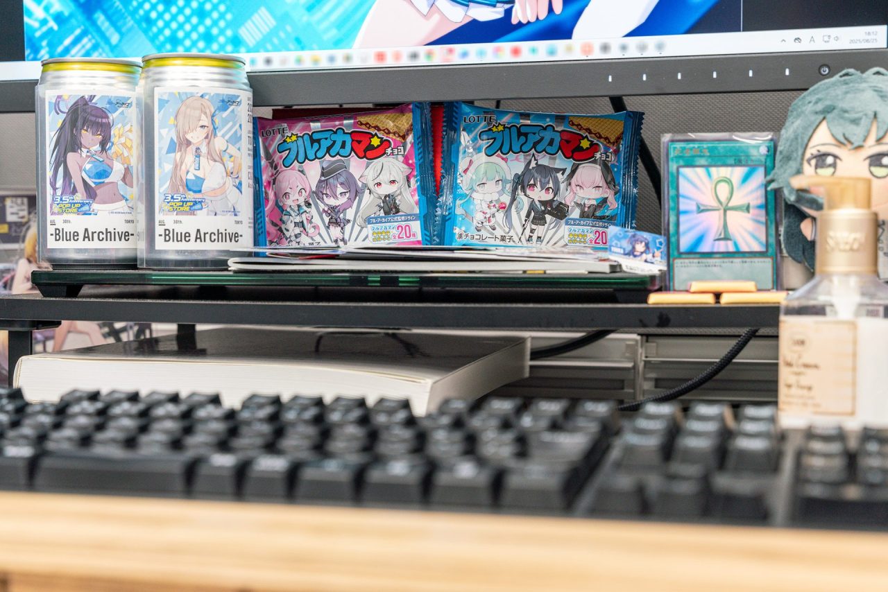 視線移動や首への負担といった人間工学的な配慮だけが目的ではありません。上段にはアスナとカリンの壁紙を採用しています。視線を上に向けると二人と目が合う構図になっています。まるで『頑張って』と応援されているような気持ちになり、視覚的なリフレッシュ効果が期待できます。