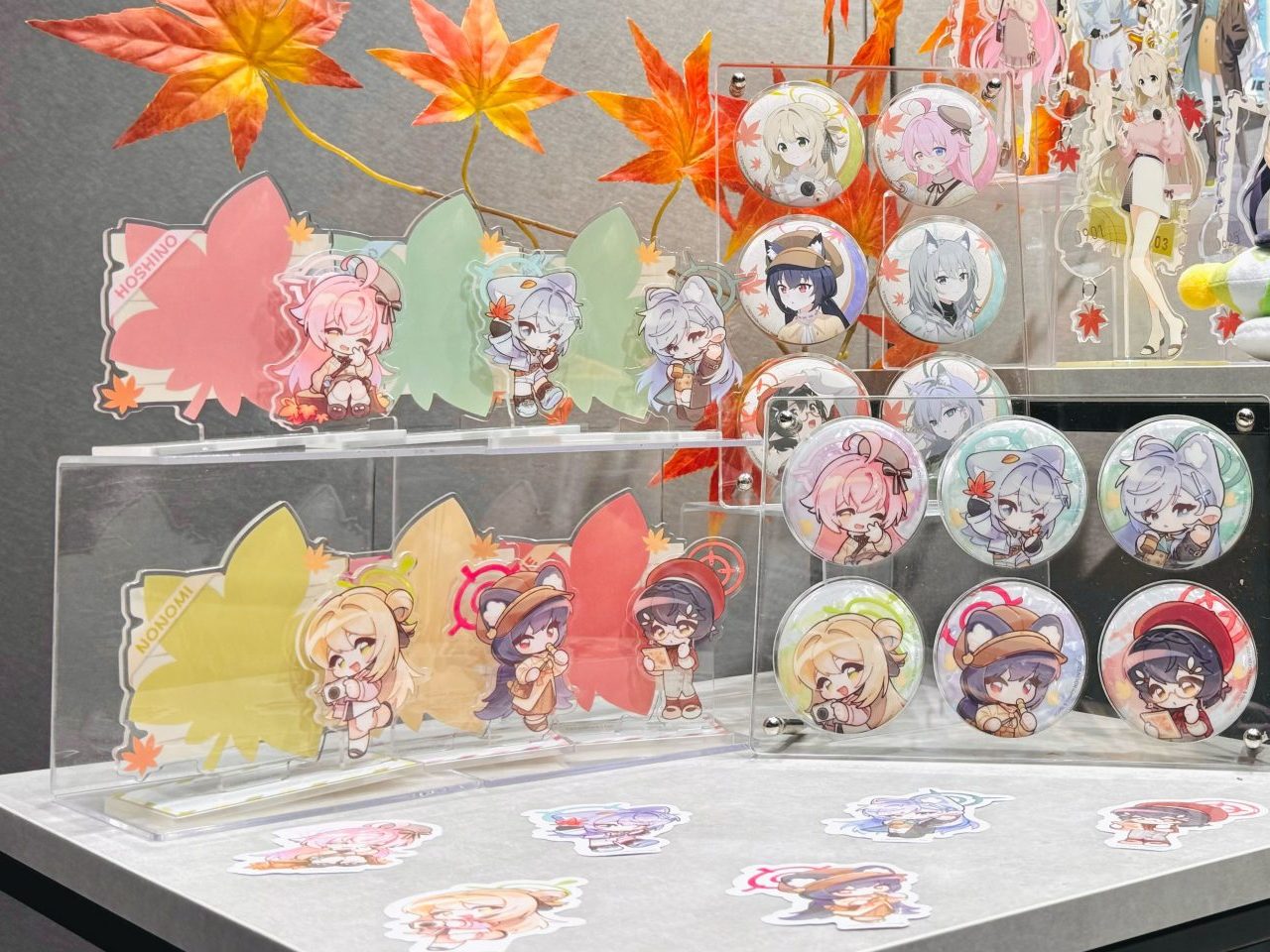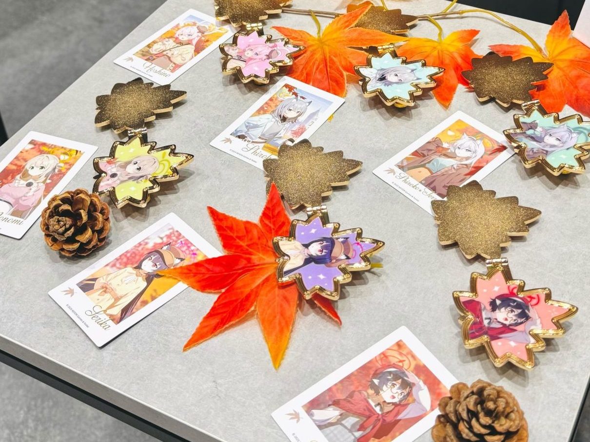 アクリルスタンドは、旅を思わせる切手風背景とキャラクターの二枚仕様。紅葉のチャームがゆらゆらと揺れて、秋の風情を感じさせてくれます~