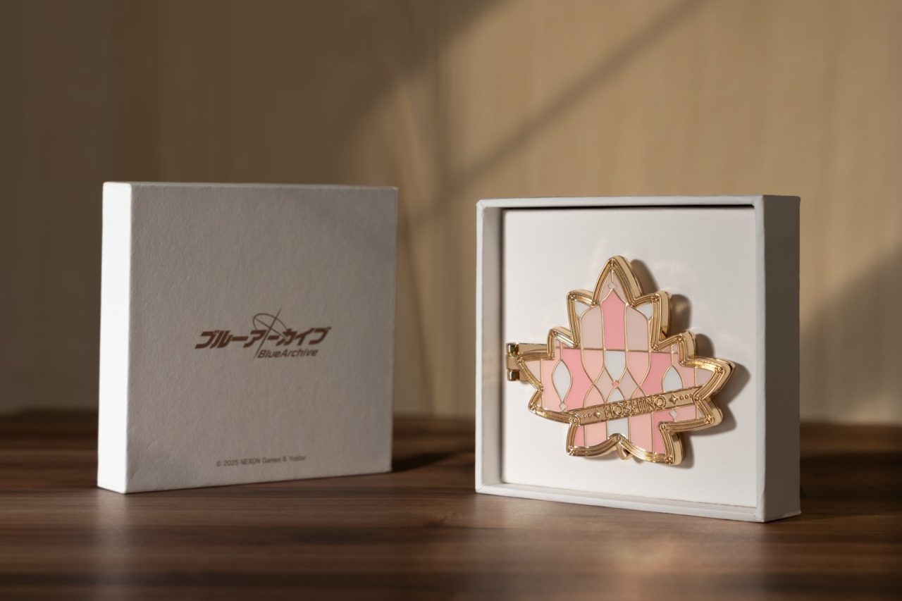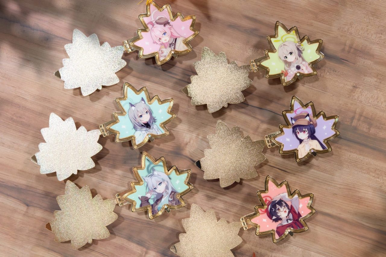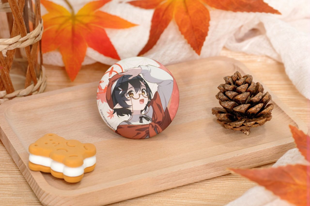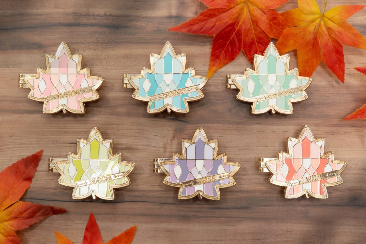 紅葉がモチーフの開閉式ピンバッジが登場!表には生徒たちのお名前をあしらっていて、開くと中から生徒のかわいいビジュアルが姿を表します。縦約65×横約74mmと存在感のあるサイズで、金属製の重厚な質感も高級感を演出しています。