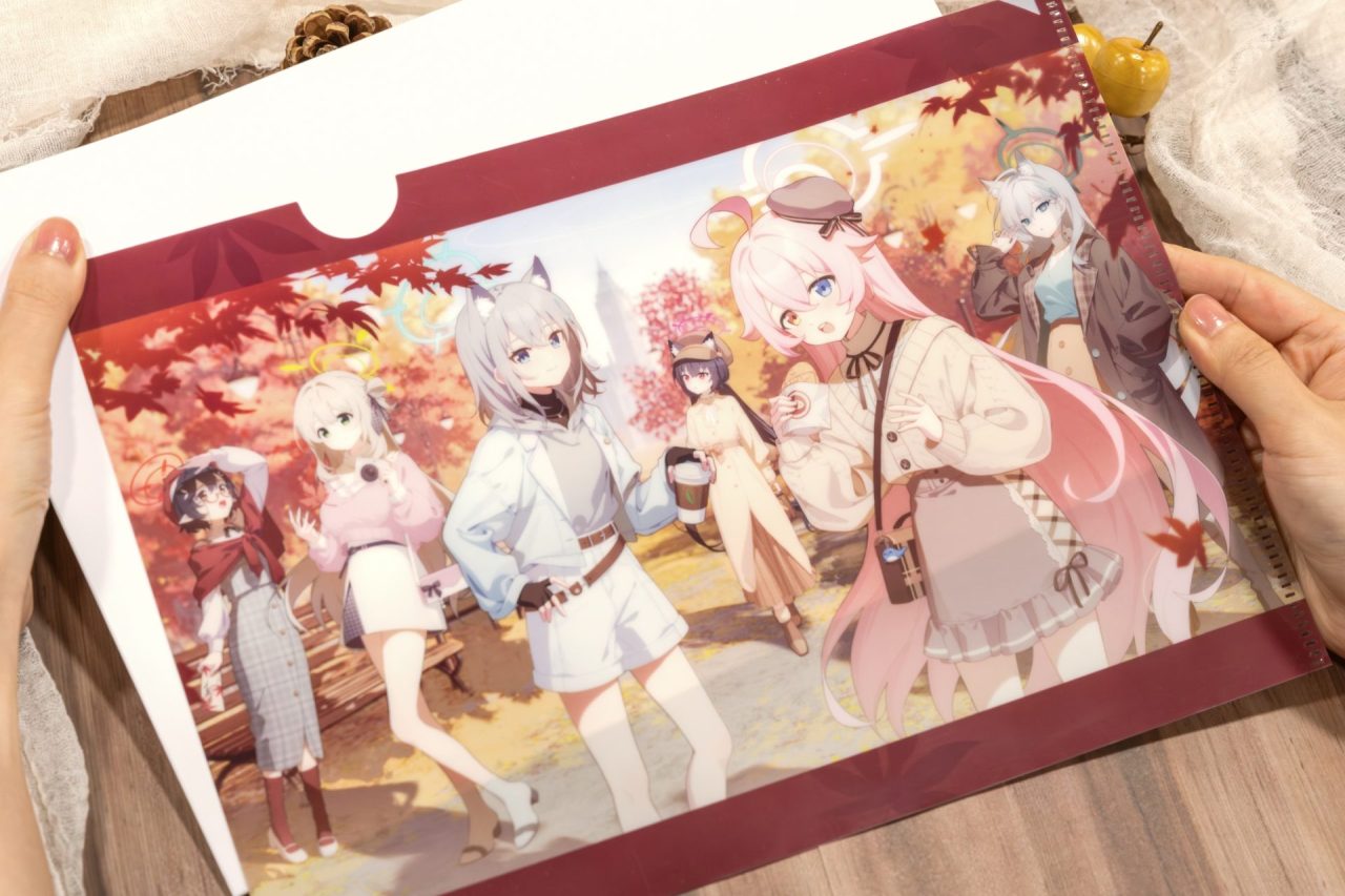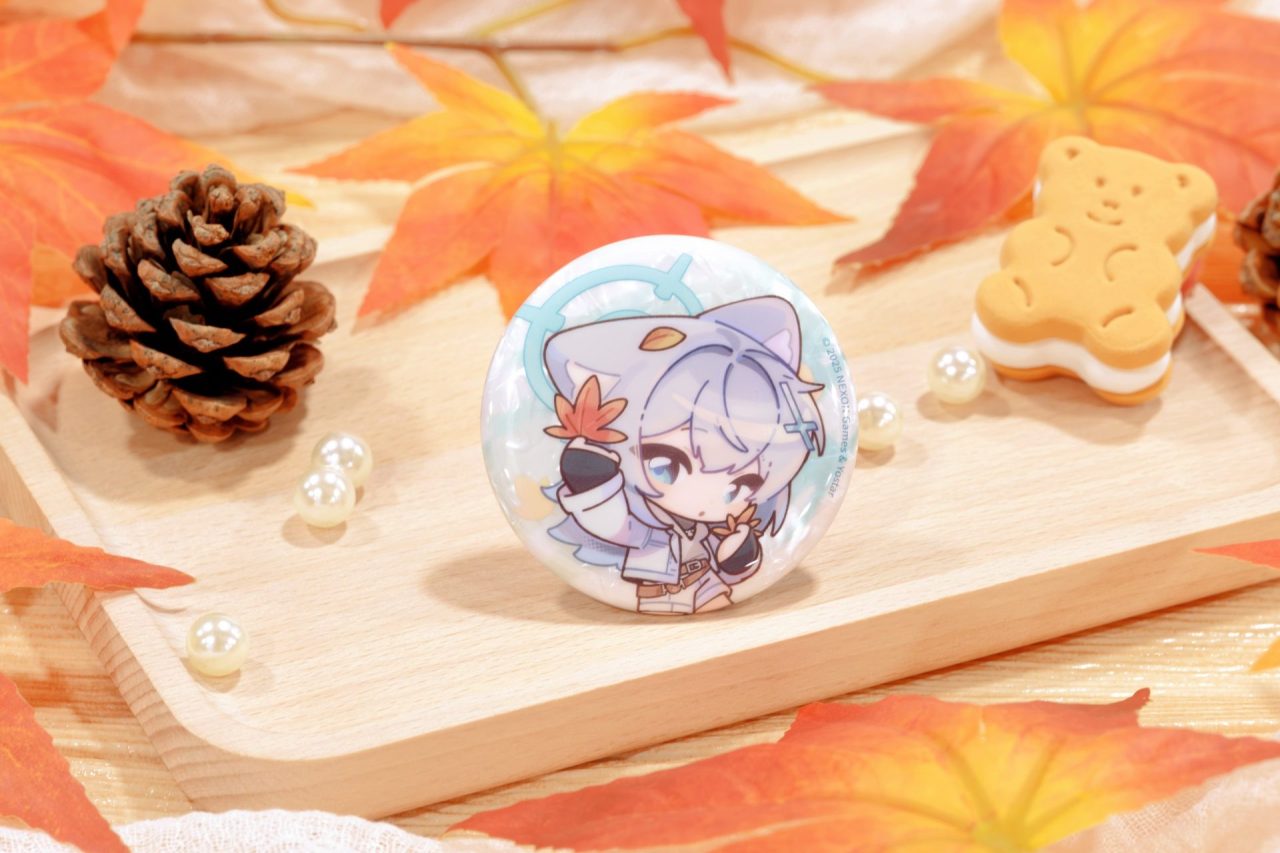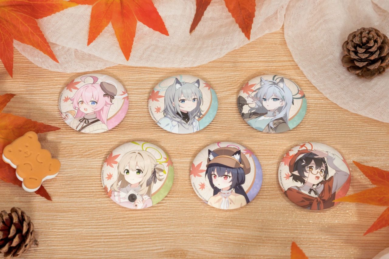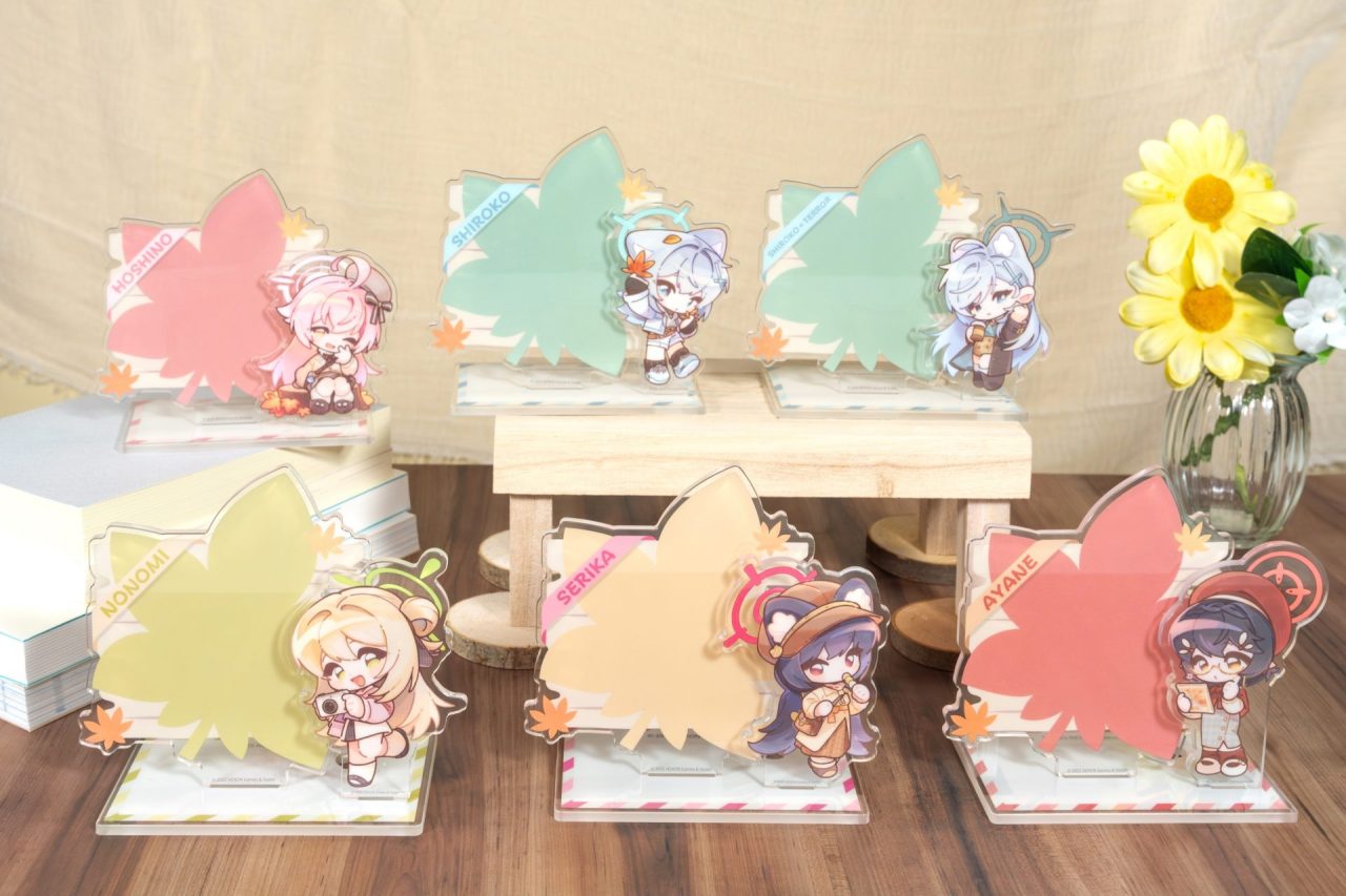 イラストには秋色が広がる中、アビドス高等学校の生徒たちが私服でお出かけを楽しむ姿が収まっています。切手をイメージしたアクリルスタンドや紅葉がモチーフの開閉式ピンバッジなど、旅気分を味わえるアイテムがラインナップ。ぜひ最後までご覧ください!