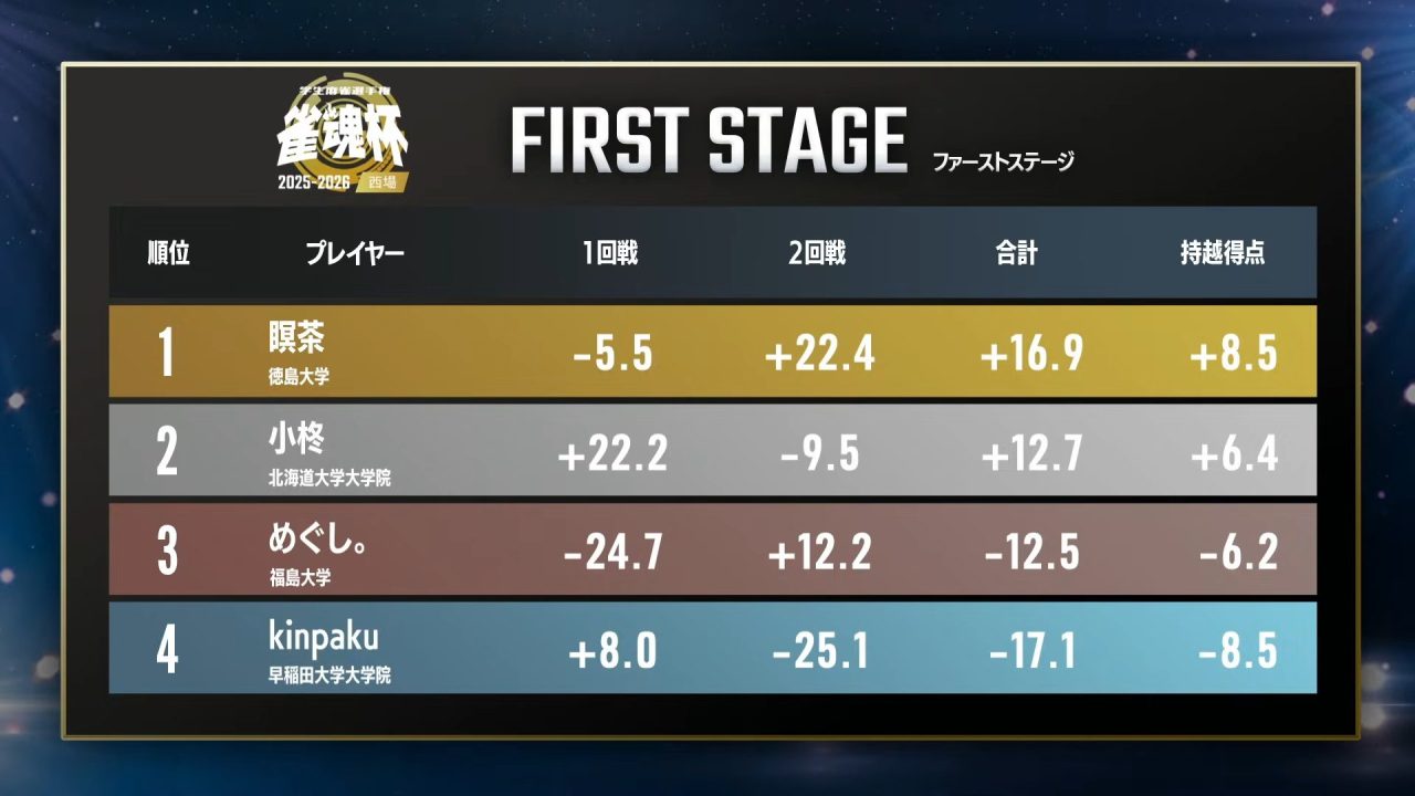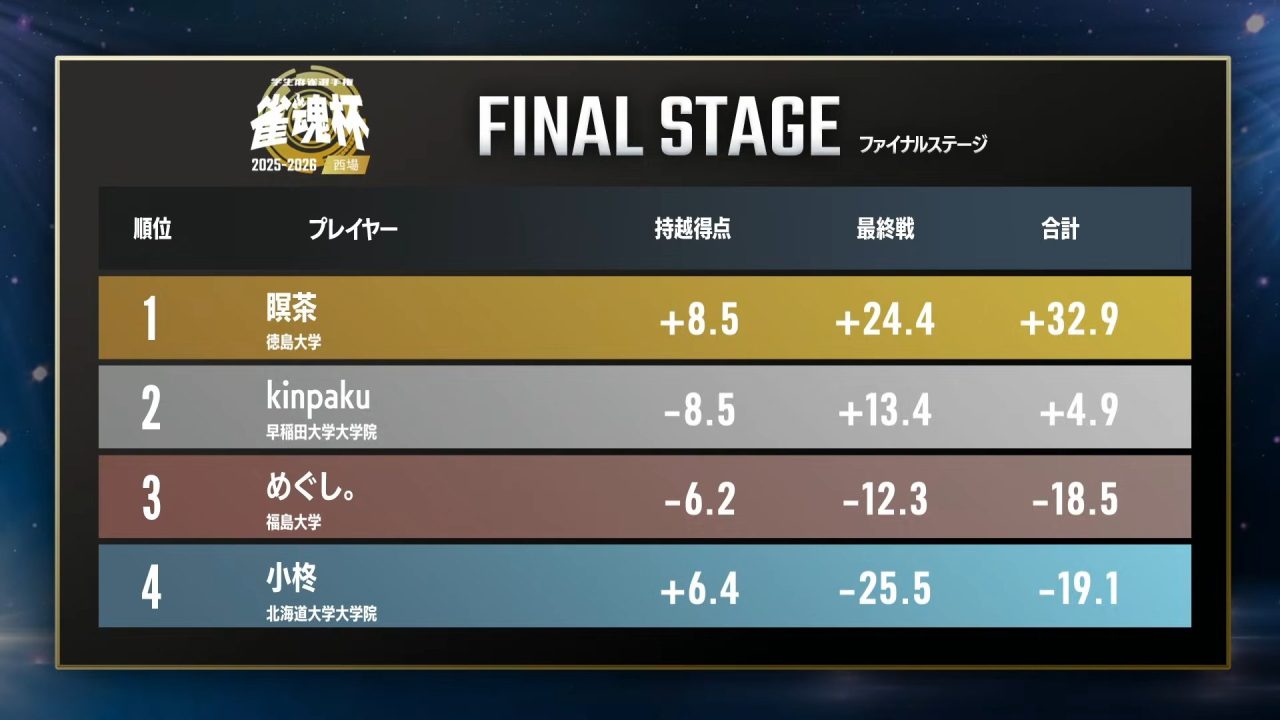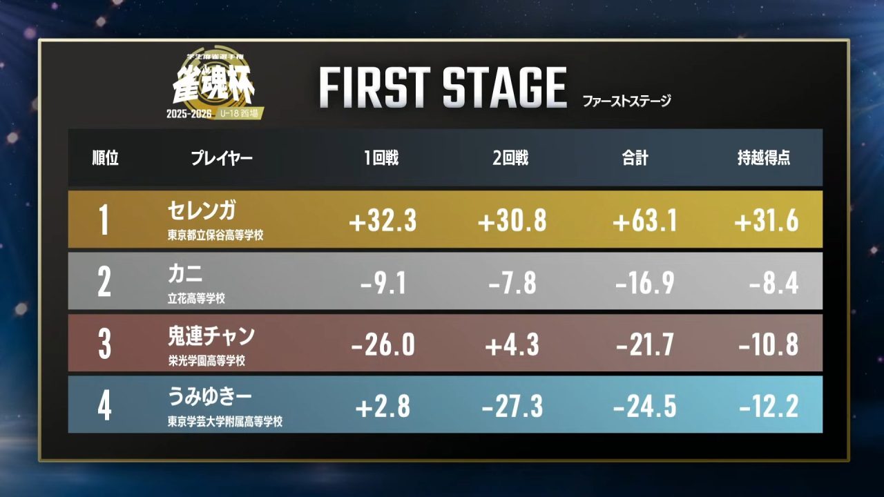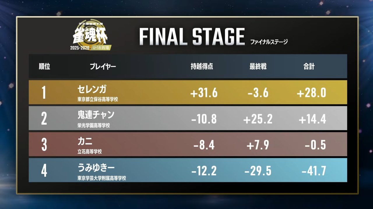 しかし、この時点でもまだ決着はつかず、勝負は南4局二本場(にほんば)にもつれ込みます。最後はアガりきれず3着でフィニッシュしたものの、FIRST STAGEからの総得点差により、セレンガ選手が見事「西場 U-18」の頂点に立ちました。